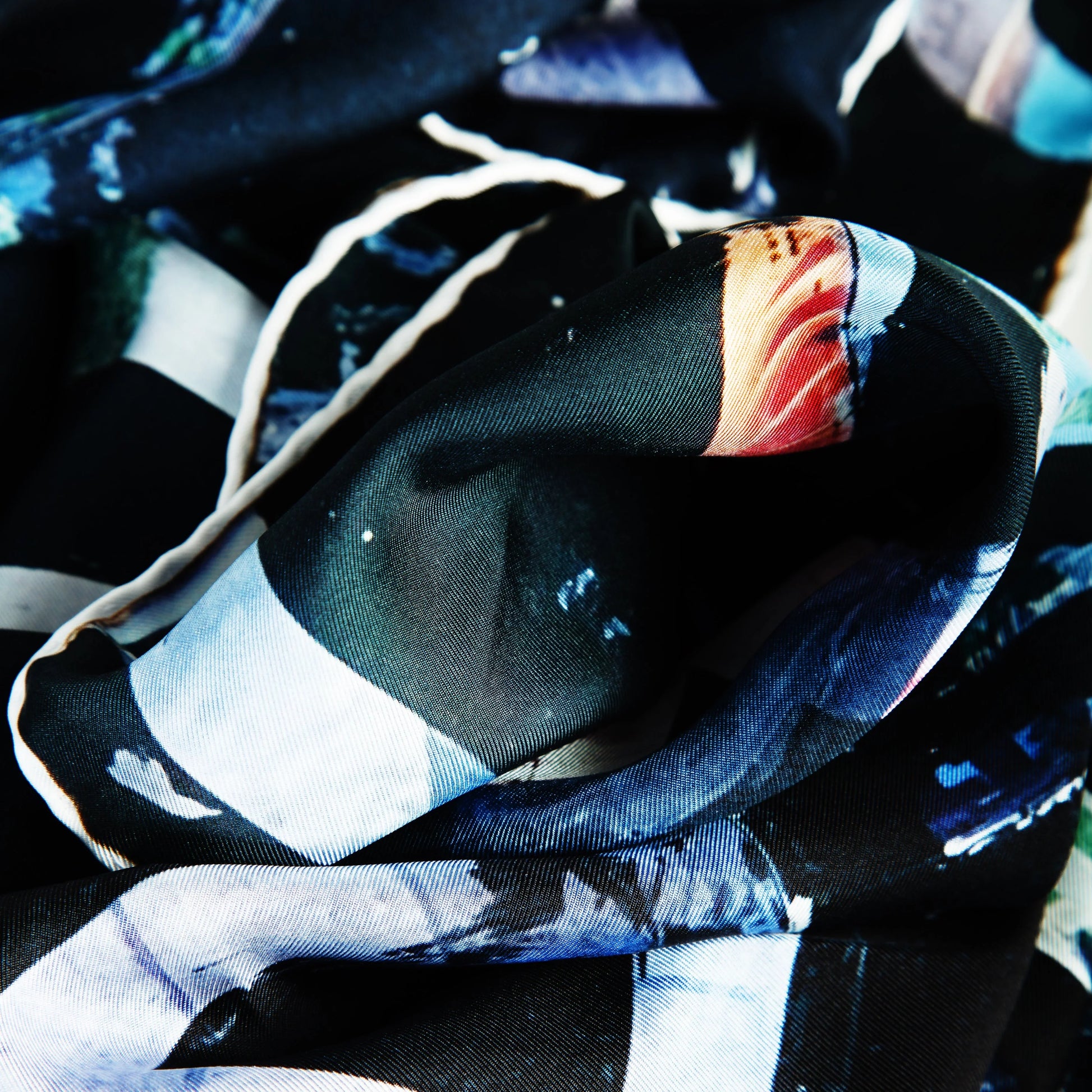 Time Was All I Wanted' are the words of the poet Emily Dickinson that I used to make this painting. I love the idea of you wearing this, because it’s a work of art that holds a universal message. The message is apparent only when the scarf is unfolded, but it’s always there: time was all I wanted.